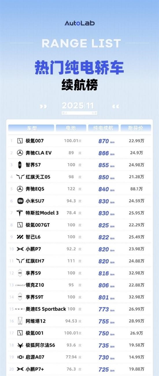 第6至10名中,小米SU7(830km,94.3度电池,24.59万元)、特斯拉Model 3(830km,78.4度电池,25.95万元)两款人气车型并列;极氪007GT(825km,100度电池,22.29万元)、智己L6(822km,100度电池,25.49万元)分列第八、九位;小鹏P7以820km续航(92.2度电池,23.98万元)进入前十。