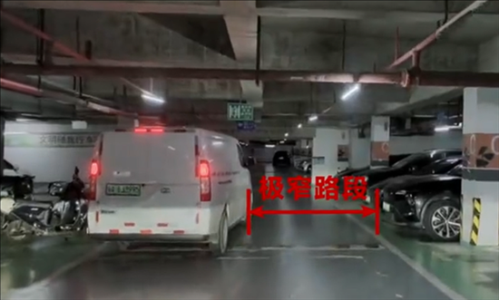 在地库窄道场景,得益于激光雷达测距可以精准到厘米级别,系统对宽距判断准确,通行处理很果决,已经超越了大部分人驾的水平。