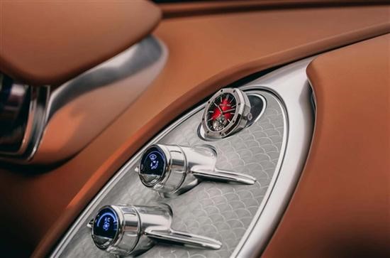 座舱内部的中控台由一整块铝合金经精密加工而成,车内织物由法国巴黎的一家工坊手工织造,还配备了一枚直径43毫米的爱彼皇家橡树系列陀飞轮腕表。