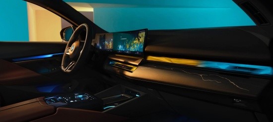 侧面修长的车头与短前悬设计强化运动姿态,贯穿式腰线从前轮拱延伸至尾灯,搭配18-20英寸低风阻轮毂(i5 M运动版配备19英寸空气动力学轮毂),营造出蓄势待发的视觉效果。车尾贯穿式尾灯组内部嵌入镀铬饰条,点亮后形成连贯式效果。2026款宝马5系后包围采用黑色防刮材质与隐藏式排气布局,i5车型增加扩散器装饰,兼顾运动感与电动化特征。
